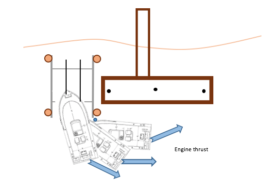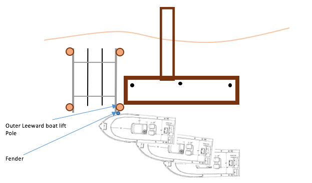 – Using simply the idle of the engine and full stb lock take the engine gently in and out of forward gear to start the boat pivoting around the fender and outer leeward boat lift pole. The position of the fender may have to be adjusted as the boat slowly moves.