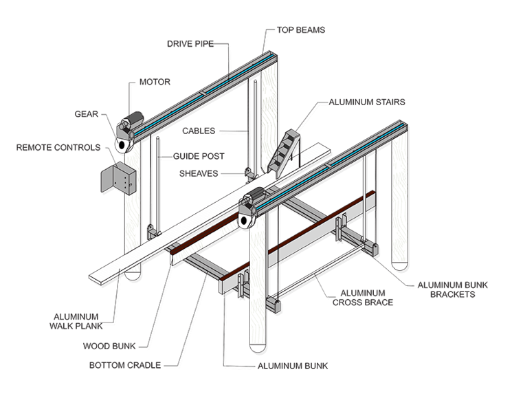 Below is a diagram of a standard boat lift set up that I am referring to. Control box, walk plank and stairs may be positioned slightly different on yours.